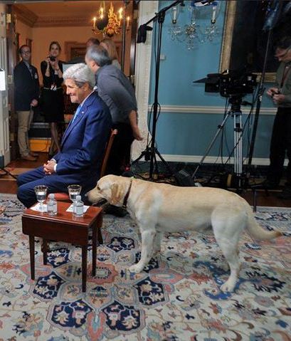 عصرایران - جان کری وزیر خارجه آمریکا در کنار سگش "بن" به هنگام آماده شدن برای انجام مصاحبه تلویزیونی در محل وزارت خارجه آمریکا در واشنگتن.
