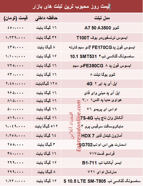 قیمت انواع تبلت‌ در بازار (جدول)