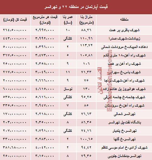قیمت آپارتمان در منطقه 22 تهران (جدول)