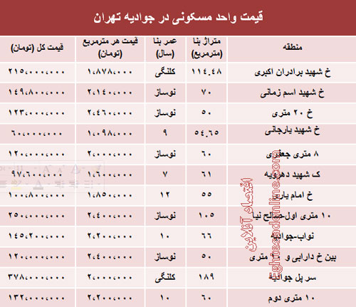 قیمت آپارتمان در جوادیه تهران (جدول)
