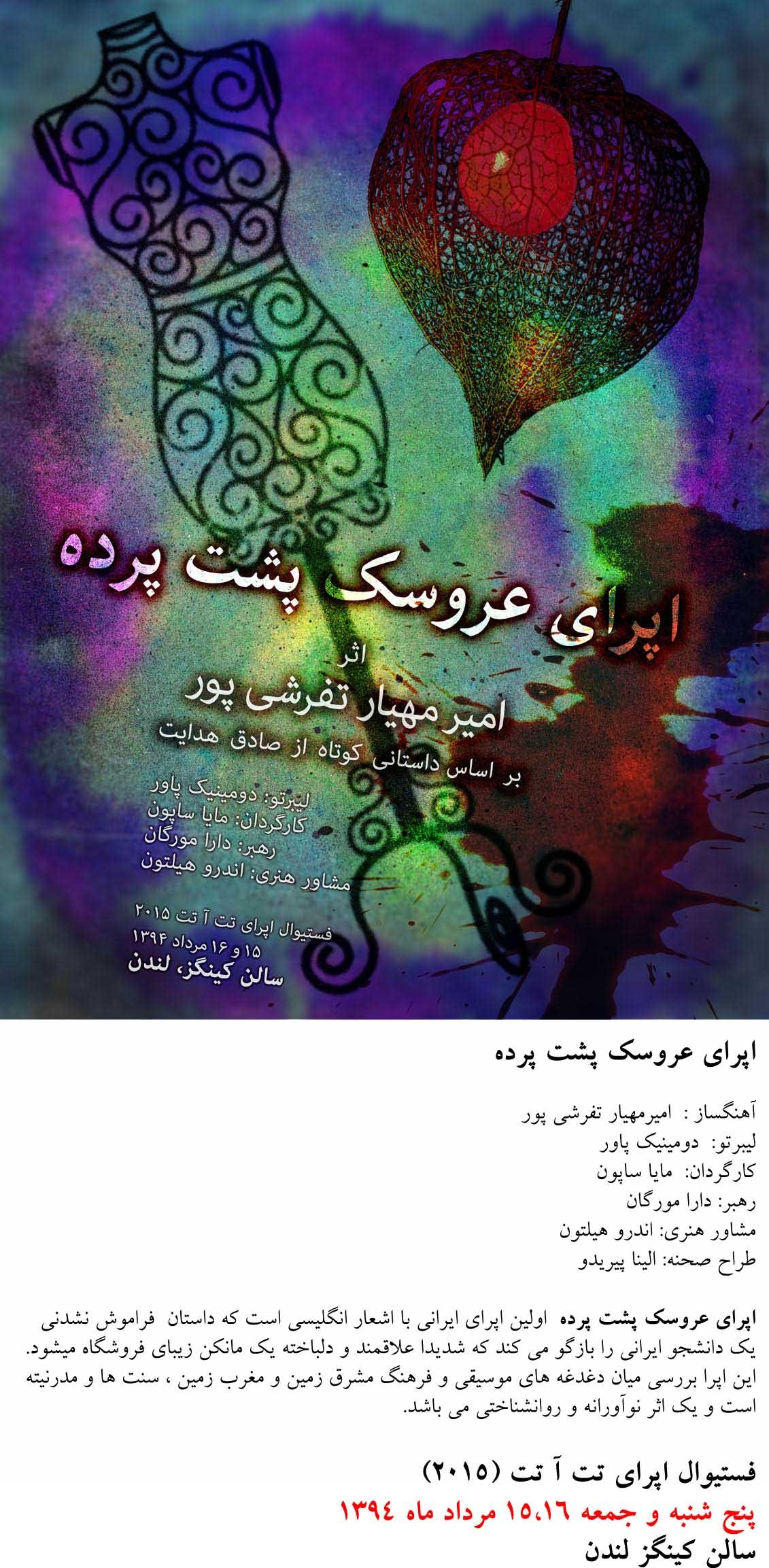 اپرای«عروسک پشت پرده» ساخته امیرمهیار تفرشی پور 15 و 16 مرداد به رهبری دارا مورگان در «فستیوال اپرای تت آ تت» و در سالن کینگز شهر لندن به اجرا در می آید.