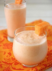 طالبی را پوست بگیرید و همراه انبه، شیر و بستنی داخل مخلوط کن بریزید.
