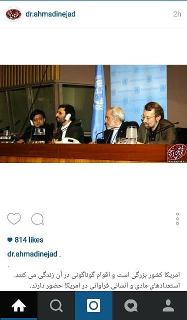 صفحه اینستاگرام محمود احمدی نژاد تصویری از کنفرانس مطبوعاتی او در سال 84 در نیویورک منتشر کرد که در کنار او محمدجواد ظریف و علی لاریجانی نیز نشسته اند.