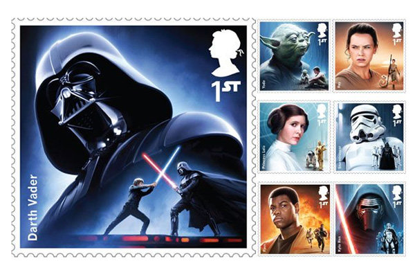 شرکت پست سلطنتی بریتانیا به مناسبت ساخته شدن «جنگ ستارگان: نیرو بیدار میشود» تازهترین فیلم از مجموعه فیلمهای جنگ ستارگان، ۱۸ تمبر جدید منتشر کرد.