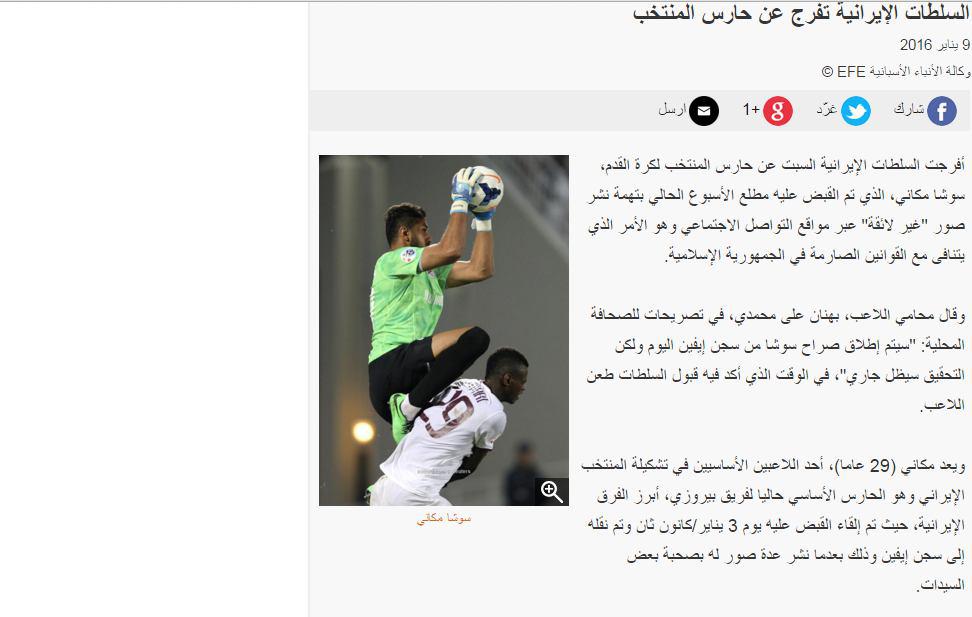 سایت کووره یکی از رسانه های معتبرعربی منطقه درباره خبر آزادی سوشا مکانی مطلب را منتشر کرده است. این سایت در این مطلب صحبت های وکیل سوشا مکانی و البته مهدی مهدوی کیا که با یکی از خبرگزاری های ایرانی را نیز درج کرده بود.