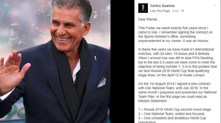 در این 5 سال 61 مسابقه ملی انجام دادیم ، با 34 پیروزی ، 19 مساوی و 8 شکست . وقتی که من به ایران رسیدم ایران در رنکینگ فیفا در میان کشورهای آسیایی در رتبه چهارم بود اما در 3.5 سال گذشته همیشه رتبه اول بوده ایم. این شرایطی است که ما با قرعه کشی مرحله نهایی مقدماتی جام جهانی روسیه در کوالالامپور در 12 ایپریل روبه رو می شویم .