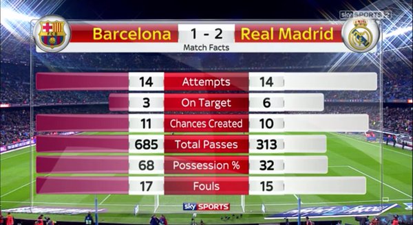 رئال هرچند پیروز دیدار ال کلاسیکو بود اما تابلوی آمار بعد از بازی نکات جالبی را داشت. به گزارش آی اسپورتهر دو تیم ۱۴ موقعیت گل داشتند.رئال ۶ شوت در چارچوب داشت و بارسلونا میزبان، سه ضربه به دروازه حریف زده بود.بارسا، ۶۸۵ پاس ارسال کرد و رئال تعداد پاس هایش فقط ۳۱۳ بود. از نظر تملک توپ نیز، بارسلونا با درصد ۶۸، برتر بود.بازی دو تیم، ۳۲ خطا داشت، داور شش بار از کارت زرد و یک بار از کارت قرمزش استفاده کرد.