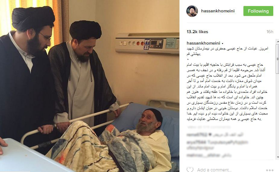 عصر ایران- سید حسن خمینی در صفحه اینستاگرامش عکسی از حاج عیسی جعفری خادم امام خمینی در بیمارستان شهید بهشتی قم منتشر کرد و نوشت: