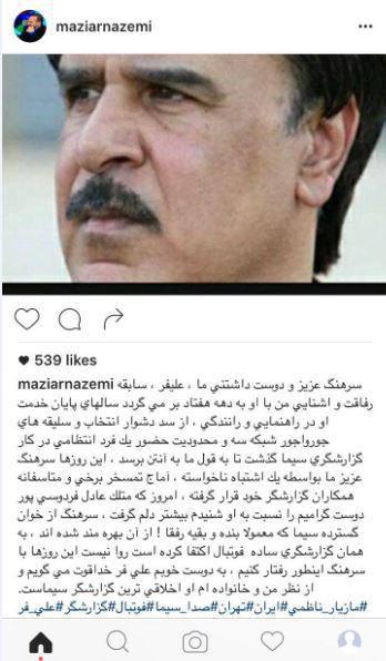 انتقاد مازیار ناظمی از کنایه فردوسی پور به سرهنگ علیفر