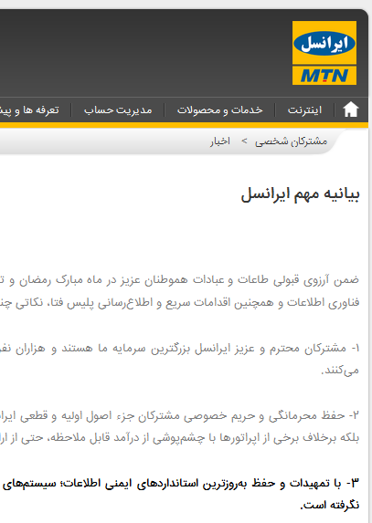 2- حفظ محرمانگی و حریم خصوصی مشترکان جزء اصول اولیه و قطعی ایرانسل است و این شرکت هرگز و تحت هیچ عنوانی نهتنها اطلاعات مشترکان خود را در اختیار غیر قرار نداده، بلکه برخلاف برخی از اپراتورها با چشمپوشی از درآمد قابل ملاحظه، حتی از ارائه اطلاعات مشترکان به شرکتهای تبلیغاتی دارای مجوز نیز خودداری کرده است. [1]