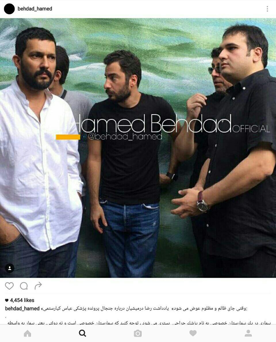 ایسنا - حامدبهداد عکسی ازتجمع سینماگران مقابل بیمارستان محل جراحی مرحوم کیارستمی دراینستاگرامش منتشرکردبرخی پزشکان بیمارستان بادردست داشتن نوشته هایی علیه مهرجویی به اقدام متقابل دست زده اند.