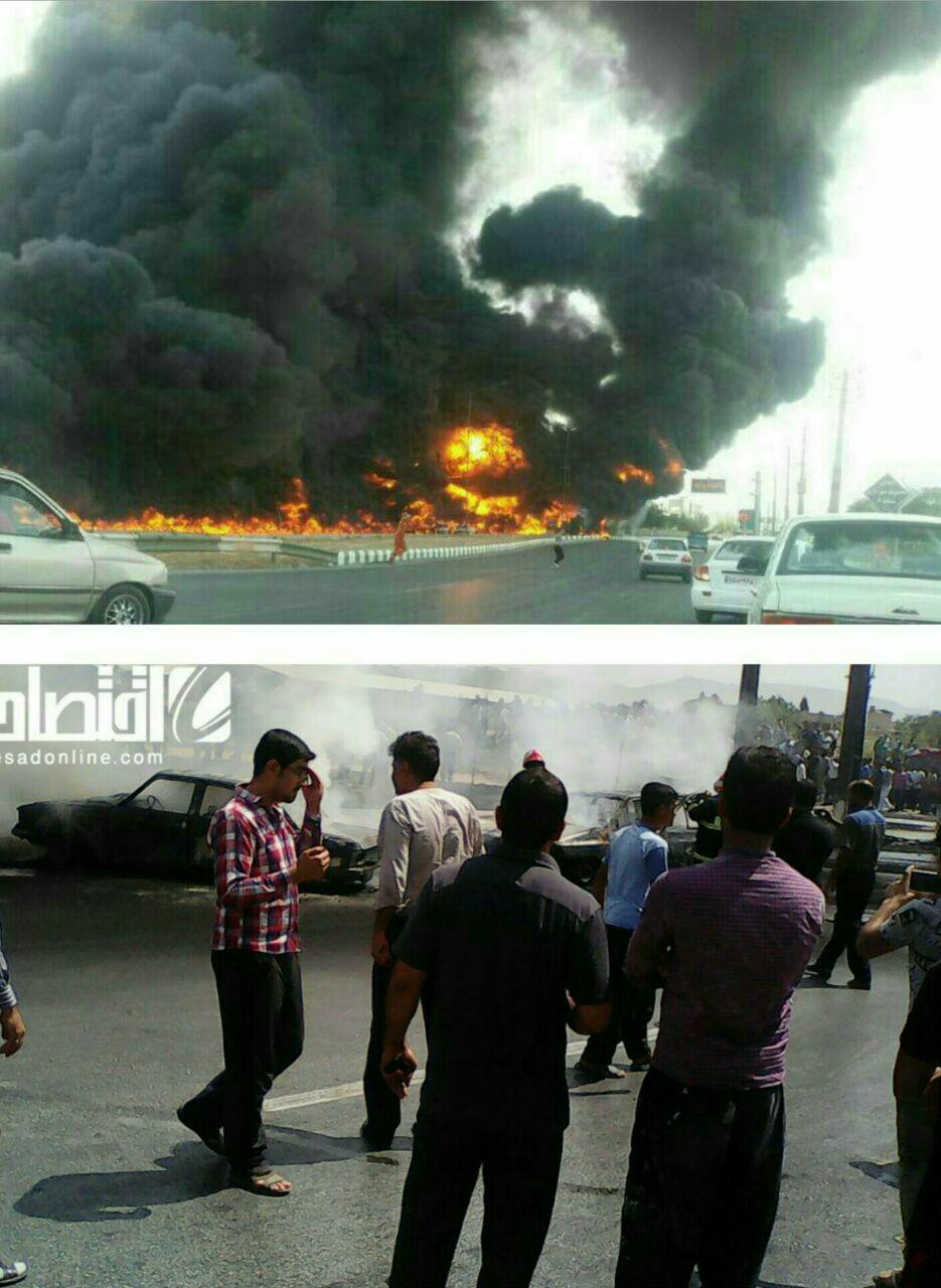 وی افزود: در اثر برخورد با تیر برق و اتصال برق تانکر حمل سوخت آتش گرفته و دو خودروی پراید و پیکان هم که در کنار تانکر حمل سوخت در حال تردد بودند، آتش میگیرند.