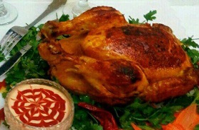 برای داخل شکم مرغمان از مواد مختلفی می توان استفاده کرد اما من فقط پیاز، فلفل دلمه ای، چند حبه سیر، هویج، جعفری خرد شده، زرشک و مقداری رب و ادویه جات را تفت داده و در داخل شکم مرغ ریختم و پارگی شکم را دوخته و پاها و بالها را به هم وصل کردم و آنرا داخل آب سرد (پیاز، فلفل دلمه ای، هویج، نمک و ادویه) گذاشته و بعد از جوش آمدن به مدت ۳۰ دقیقه پخته و بعد از پخته شدن آرام برداشته و با قلمو آنرا آغشته به زعفران کرده و در روغن سرخ کردم.