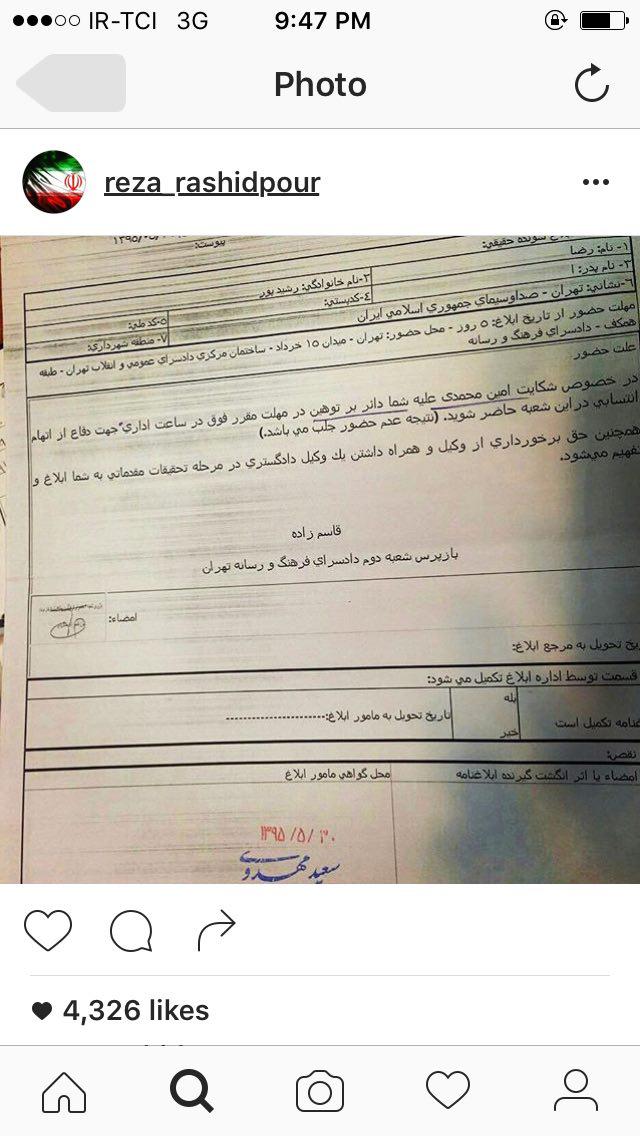 به گزارش عصر ایران، رضا رشیدپور با انتشار تصویر احضاریه خود در اینستاگرام نوشت: