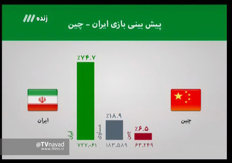 سوال پیامکی برنامه 90 دوشنبه شب در مورد بازی ایران و چین بود. دیداری که امروز ساعت 16 انجام خواهد شد. مخاطبان برنامه که در بازی اول مقابل قطر با اکثریت 90 درصدی رای به پیروزی مقابل قطر داده بودند در مقابل چین شانس پیروزی ایران را 74 می دانند. البته که حدود 19 درصد بازی را مساوی پیش بینی می کنند و حدود 7 درصد هم شانس چین را برای پیروزی زیادتر می دانند.