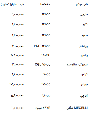 قیمت انواع موتور سیکلت در بازار (جدول)