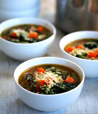 پیاز را خرد کنید داخل روغن زیتون تفت بدهید تا سبک شود بعد سیر- کرفس و هویج - قارچ مکعبی خرد شده را اضافه کنید، کمی تفت بدهید در قابلمه را بگذارید تا با حرارت کم سبزیجات کمی نیم پز شود.