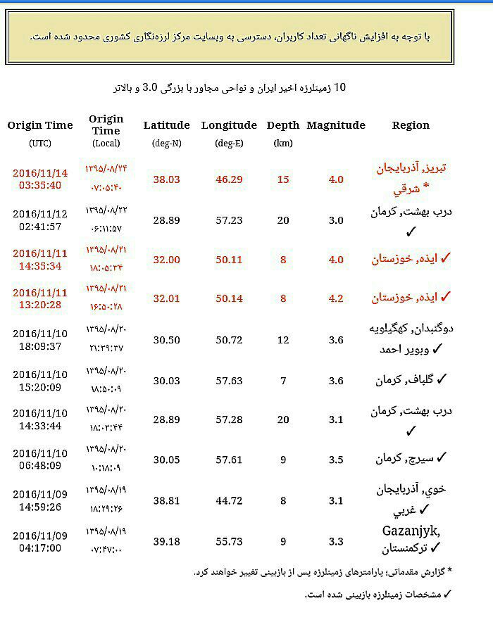 زمین لرزه ای ساعت ۷:۰۵ صبح امروز به بزرگی ۴ ریشتر تبریز و شهرهای اطراف را لرزاند. مرکز این زمین لرزه در عمق ۱۵ کیلومتری زمین بود.
