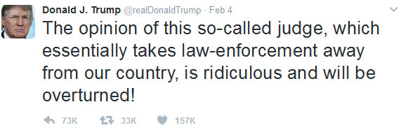 از جمله این توییت ها ، توییت 3 روز پیش او در محکومیت اقدام قاضی ایالت واشنگتن در لغو موقت فرمان اجرایی ضد مهاجرت اوست.