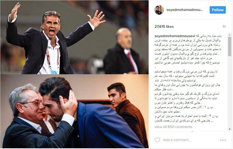 سید محمدموسوی ستاره تیم ملی والیبال از کارلوس کی روش حمایت کرد. حمایتی که بوی انتقاد از انتخاب سرمربی تیم ملی والیبال هم می دهد. به گزارش عصرایران ، ستاره تیم ملی والیبال در پست اینستاگرامی خود اعتراف کرده که تیم ملی والیبال پس از ولاسکو ادعای خوب بودن داشته و هیچ وقت نتوانسته خوب باشد. او با این پست هشدار داده که تیم ملی فوتبال ایران هم در آستانه قرارگرفتن در چنین شرایطی است.