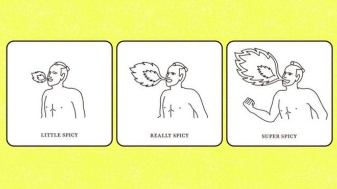 مثلا یکی از طرح‌ها خوک خندانی است در یک کاسه، به این معنا که در این غذا از گوشت خوک استفاده شده. یک طرح دیگر مردی است خیس که آن‌قدر از تنش آب چکیده که زیر پایش گودال آب درست شده و یک اردک پلاستیکی روی آن شناور است. این طرح برای این است که به بازدیدکنندگان از چشمه‌های آب‌گرم یادآوری کند پیش از اینکه به رختکن بروند خودشان را خشک کنند.