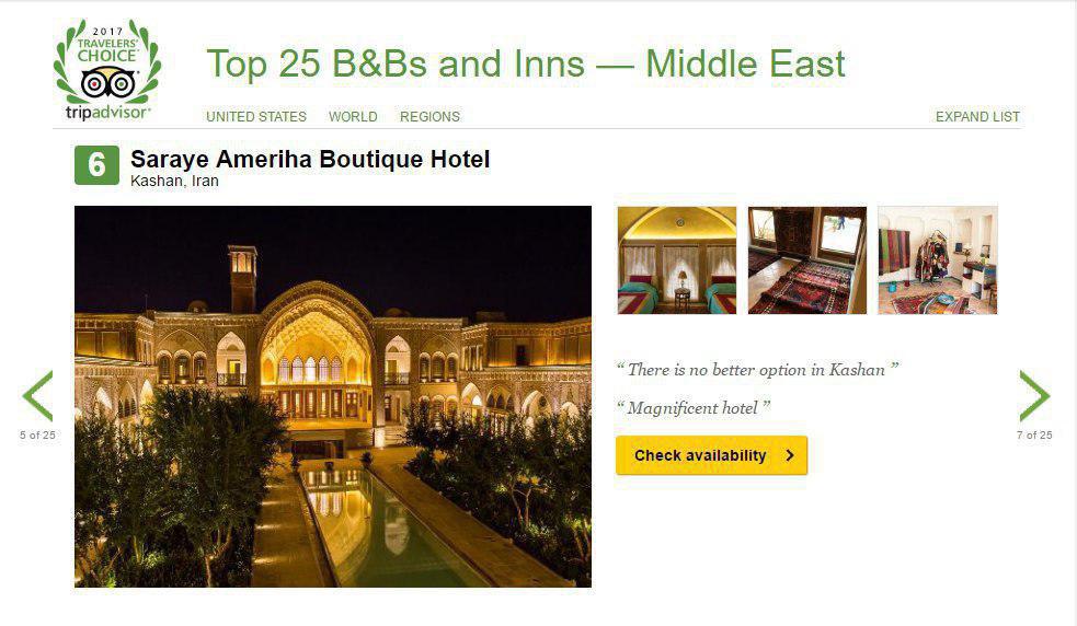 این هتل امسال نیز با 15 رتبه صعود، برنده جایزه "بهترین انتخاب مسافران 2017 در تریپ ادوایزر" شد و در جمع 6 اقامتگاه برتر خاورمیانه قرار گرفت.