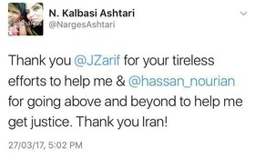 نرگس کلباسی اشتری بانوی نیکوکار ایرانی که روز شنبه - ۵ فرودین - از سوی دادگاه تجدیدنظر «رایاگادای» هند، از اتهام به قتل تبرئه شد، در توئیتر خود از محمدجواد ظریف و ملت ایران تشکر کرد.