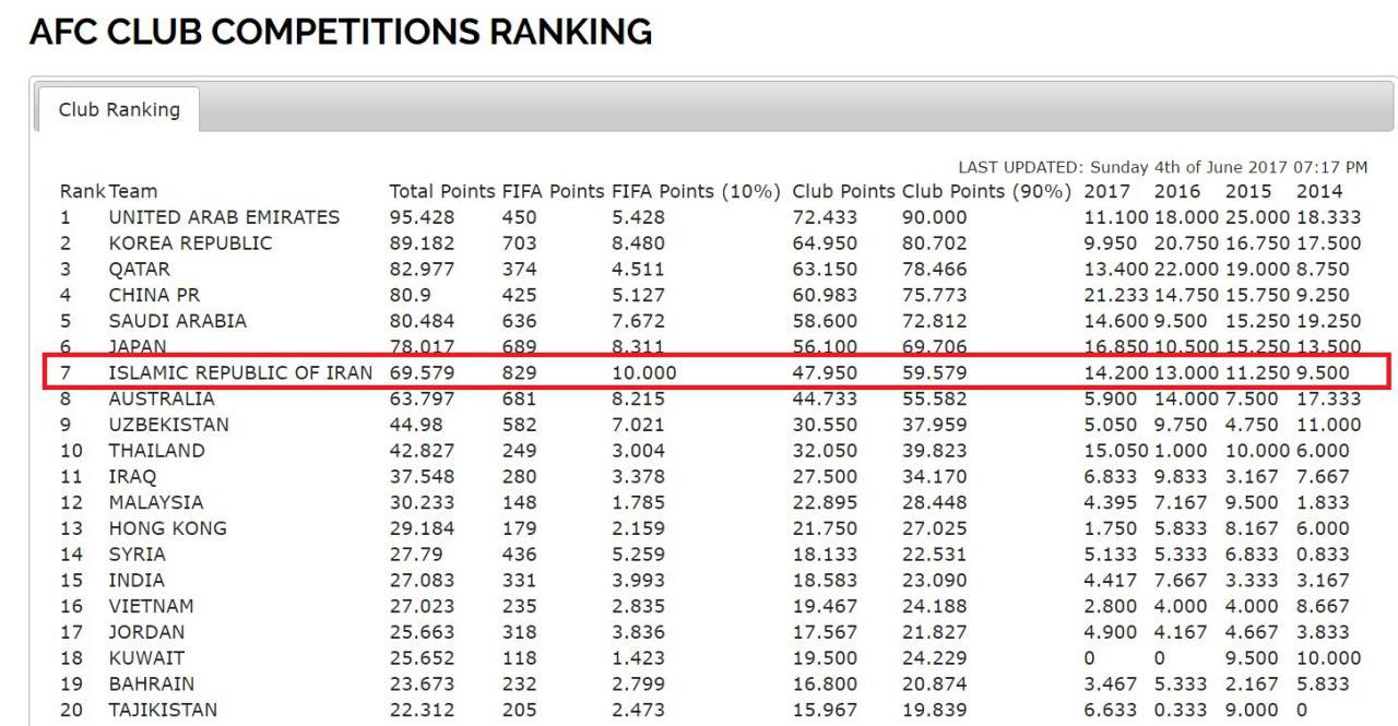 به گزارش عصرایران با اعلام نهایی جدول امتیازات تیم های آسیایی حاضر در لیگ قهرمانان آسیا ایران همچنان در رتبه هفتم قرار دارد و این رتبه سهمیه ای برابر با 2+1 برای ایران خواهد داشت.