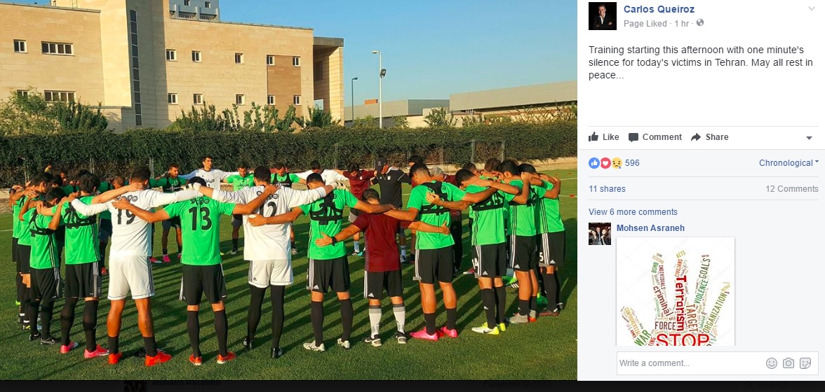 تمرین چهارشنبه بعد از ظهر تیم ملی ایران بایک دقیقه سکوت آغاز شد. یک دقیقه سکوت به احترام شهداومجروحان حادثه تروریستی تهران. عکسی که می بینید مربوط به این تمرین است . کارلوس کی روش هم در فیس بوکش با انتشار این عکس نسبت به این اتفاق تلخ واکنش نشان داد.