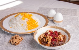 رب انار و گردوی تفت داده شده را به مواد افزوده و بگذارید تا جا بیفتد. سپس از روی حرارت برداشته، داخل ظرفی سرو کرده و روی آن زرشک بریزید.