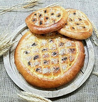 برای یک ساعت، بعد از یک ساعت پف خمیر را گرفته و دوباره می گذاریم ربع ساعت دیگر استراحت کند بعد از آن روی سطح صاف کمی آرد پاشیده از خمیر برداشته آن را با وردنه گرد پهن می کنیم دور تا دور خمیر را بوسیله یک کاسه خط می اندازیم و با چاقو تعدادی خط وسط آن زده زرده و شیر را با هم مخلوط کرده با برس به آرامی روی نان بکشید.