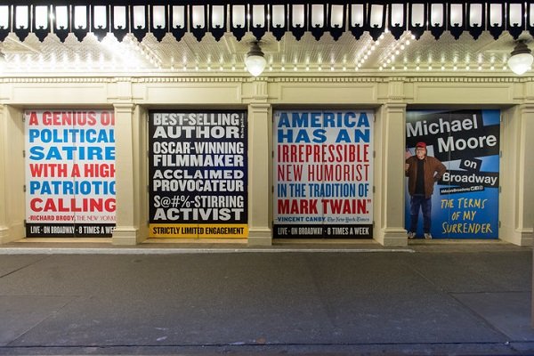 مایکل مور در نمایشی یک نفره در برادوی روی صحنه رفت و گفت حاضر به زندگی در آمریکای ترامپ نیست.