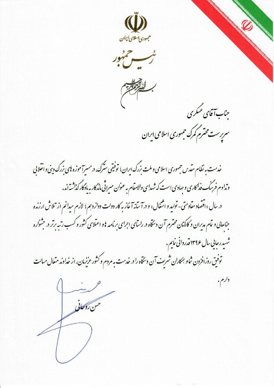 لوح تقدیر رئیس جمهور روحانی به فرود عسگری سرپرست گمرک ایران