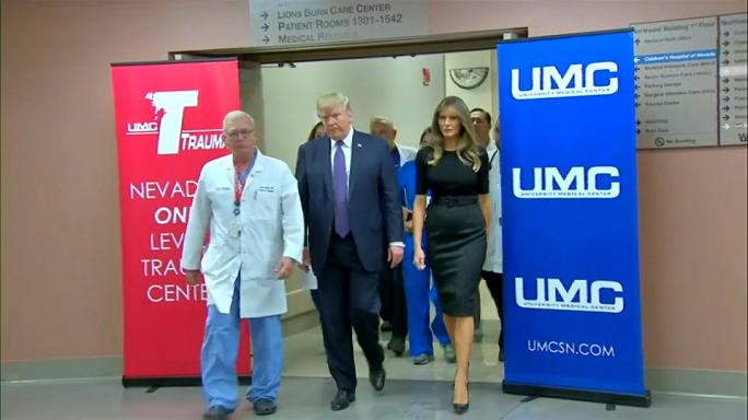 دونالد ترامپ پزشکان، پرستاران و نیروهای پلیسی را که در نجات جان شهروندان در لاسوگاس کمک کردند، «قهرمان» نامید و بسیار از آنان قدردانی کرد. وی در عین حال در مورد انگیزه فرد مهاجم با احتیاط سخن گفت و او را «یک مرد بیمار» خواند.