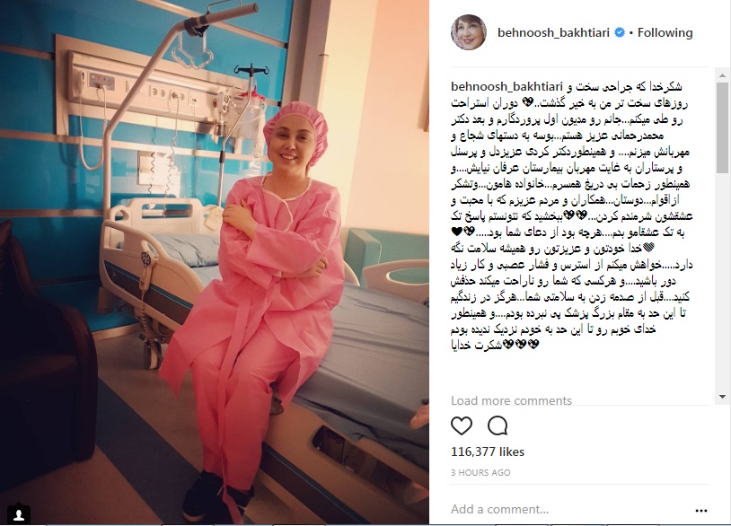 او با انتشار عکسی از خود روی تخت بیمارستان نوشت: «شکرخدا که جراحی سخت و روزهای سخت‌تر من به‌خیر گذشت... دوران استراحت رو طی می‌کنم... ازاقوام...دوستان... همکاران و مردم عزیزم که با محبت و عشقشون شرمندم کردن... ببخشید که نتونستم پاسخ تک به تک عشقامو بدم....خدا خودتون و عزیزتون رو همیشه سلامت نگه دارد.....خواهش می‌کنم از استرس و فشار عصبی و کار زیاد دور باشید....و هرکسی که شما رو ناراحت می‌کند حذفش کنید....قبل از صدمه زدن به سلامتی شما...هرگز در زندگیم تا این حد به مقام بزرگ پزشک پی نبرده بودم....و همینطور خدای خوبم رو تا این حد به خودم نزدیک ندیده بودم.