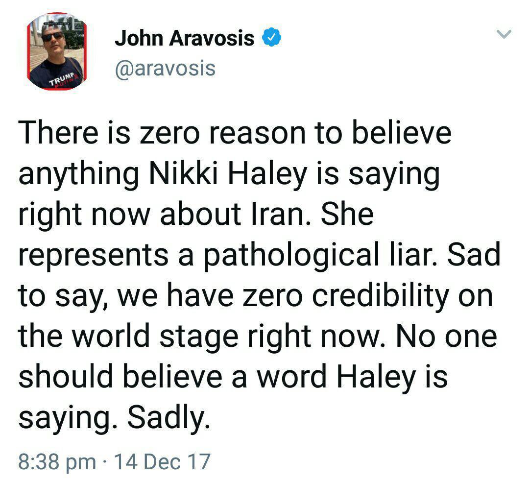 هیچ دلیلی برای باور کردن اظهارات هیلی درباره ایران وجود ندارد. او نماینده یک دروغگوی بیمار (ترامپ) است.