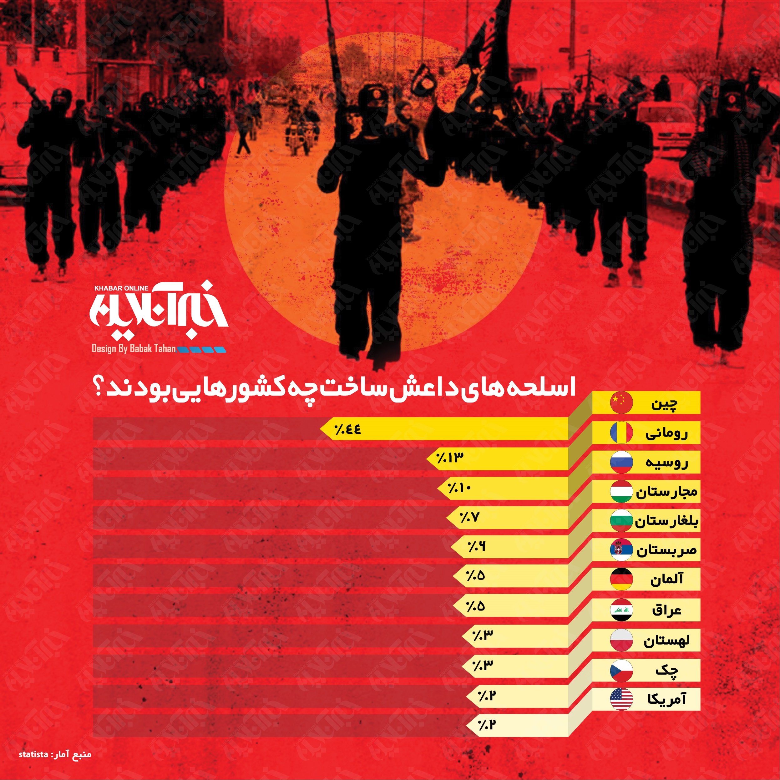 طبق آمار منتشر شده در سایت استاتیستا 44 درصد اسلحه‌های داعش ساخت چه کشورچین و 2 درصد آن ساخت آمریکا بوده‌اند.
