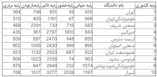 دانشگاههای علوم پزشکی تهران، صنعتی شریف، صنعتی امیرکبیر، تربیت مدرس، صنعتی اصفهان، علم و صنعت ایران، فردوسی مشهد، علوم پزشکی شهید بهشتی و شیراز رتبههای دوم تا دهم دانشگاههای ایران در این رتبهبندی را به دست آوردهاند.