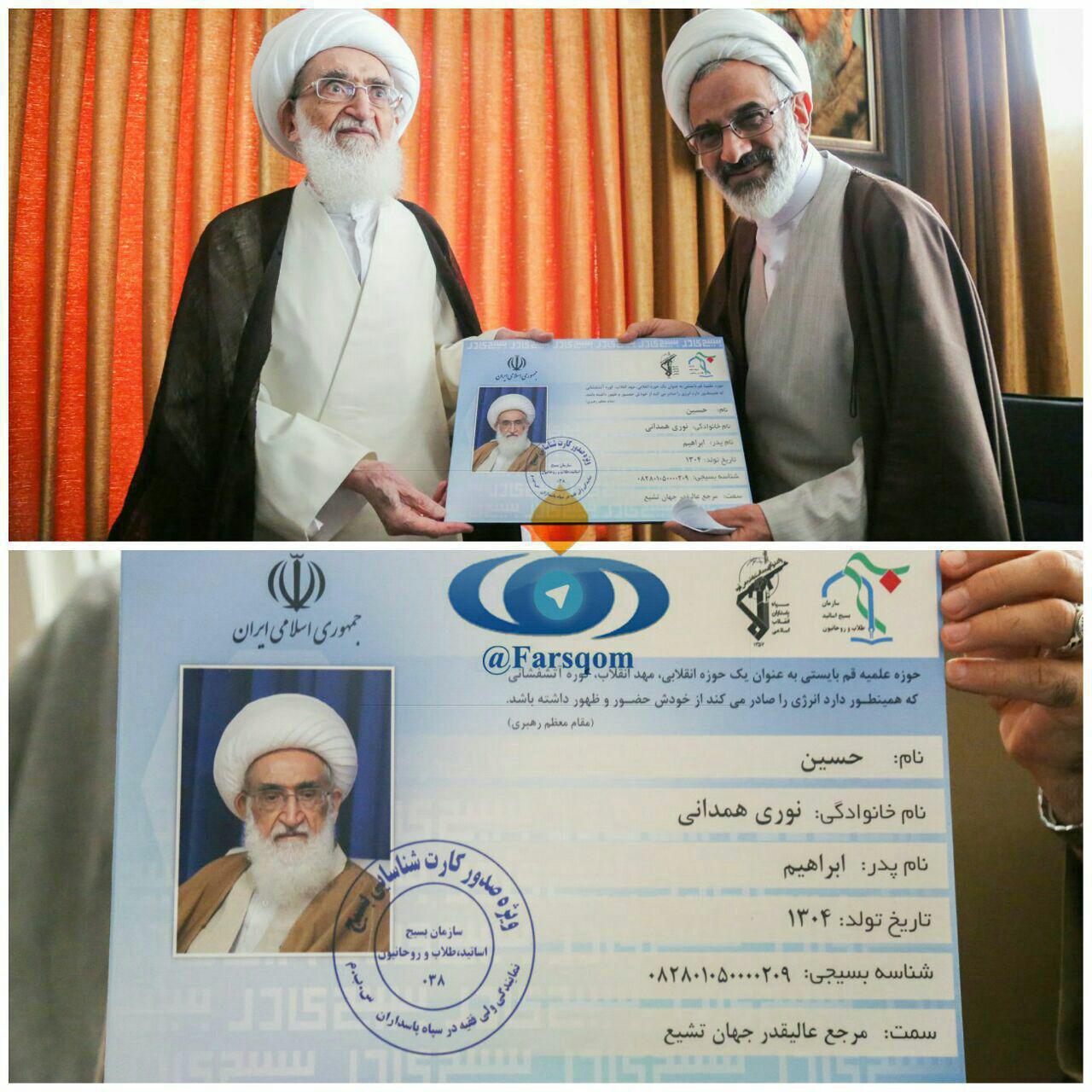برای آیت الله نوری همدانی مرجع تقلید شیعه کارت بسیج صادر شد.