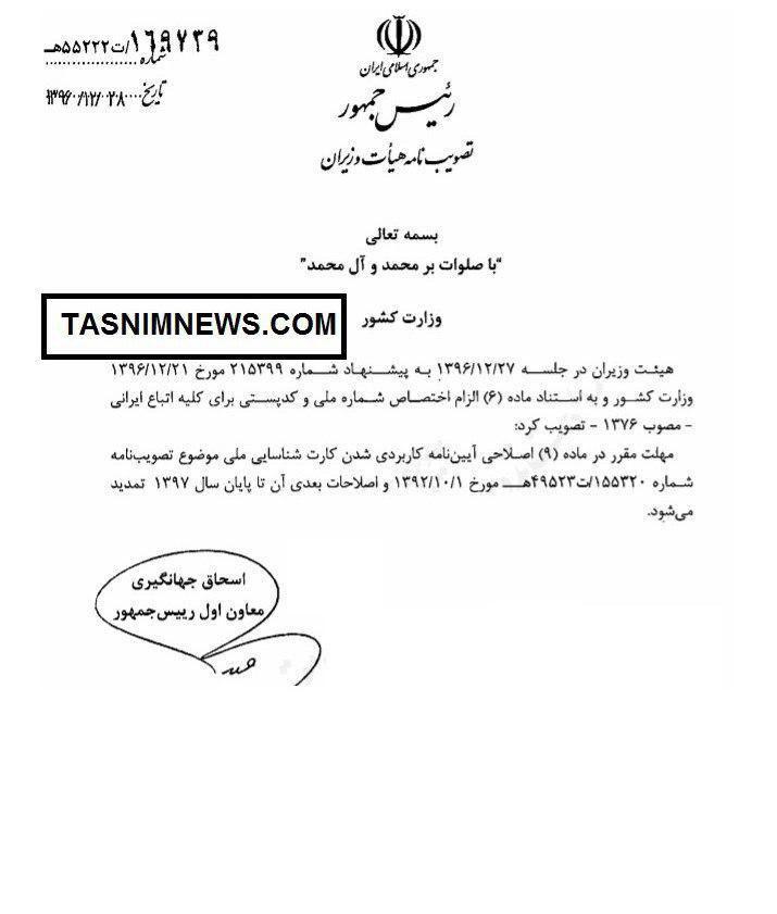 بر اساس مصوبه هیئت دولت، مهلت کاربردی شدن کارت شناسایی ملی تا پایان سال ۹۷ تمدید شد