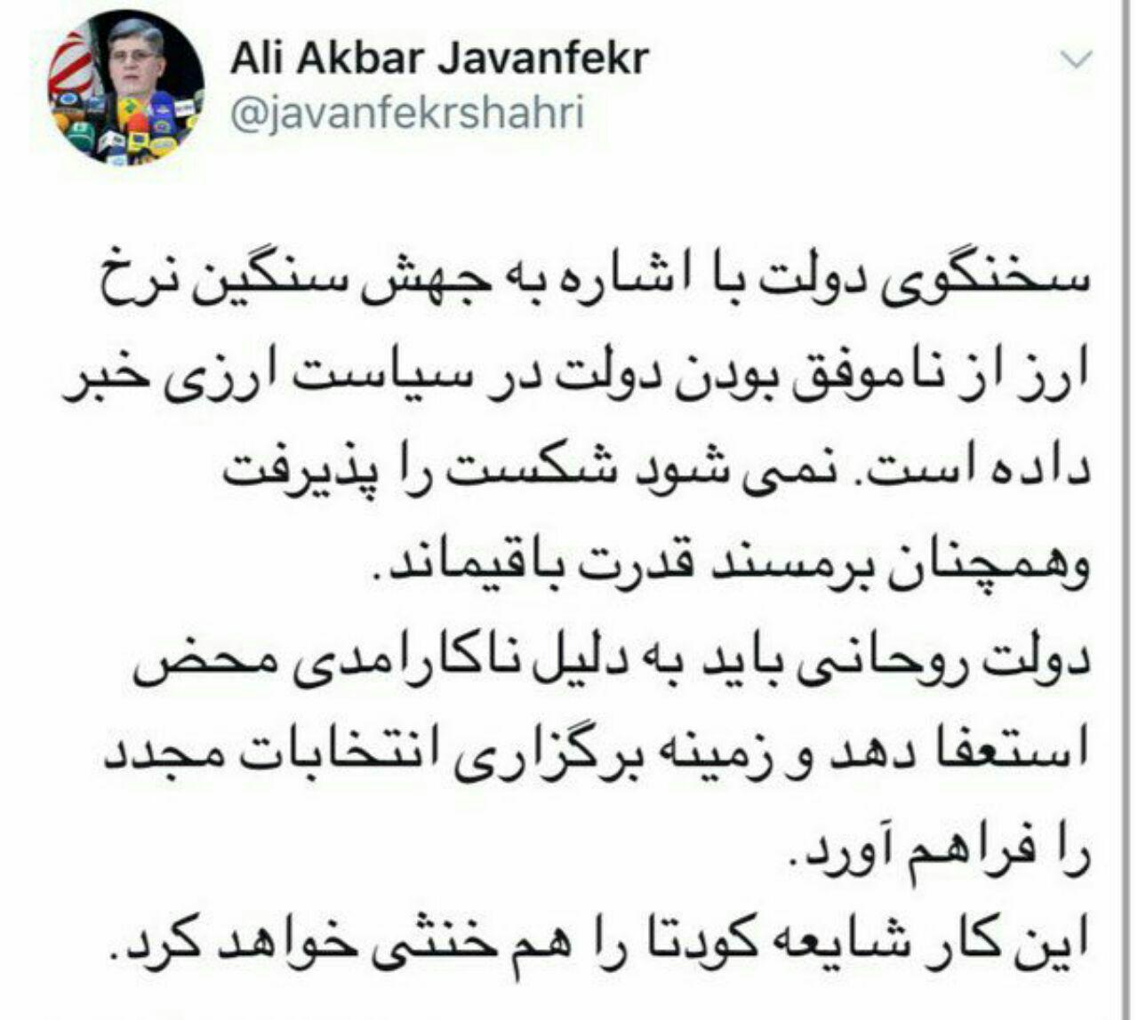 علی‌اکبر جوانفکر، مشاور رسانه‌ای رئیس دولت‌های نهم و دهم خواستار استعفای روحانی شد.