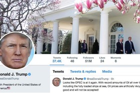 ترامپ در توییتی نوشت: "به نظر می‌رسد اوپک دوباره قیمت‌ها را بالا برده است. با میزان بالایی نفت که وجود دارد از جمله نفتکش‌های بارگیری شده در دریا قیمت نفت به طور مصنوعی بسیار بالا رفته است. این موضوع خوب نیست و قابل قبول نخواهد بود".