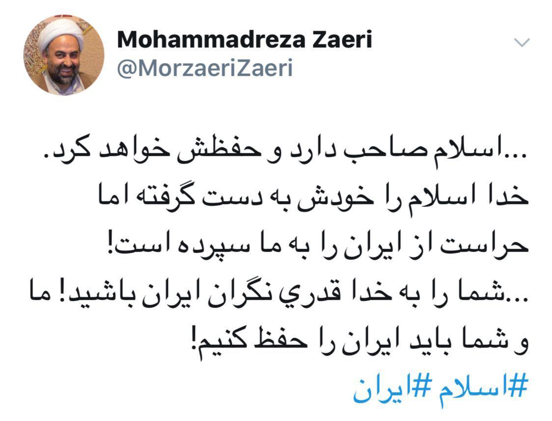 توئیت «محمدرضا زائری» پژوهشگر و نویسنده - شفقنا: خدا خودش اسلام را نگه می دارد، باید نگران ایران باشیم