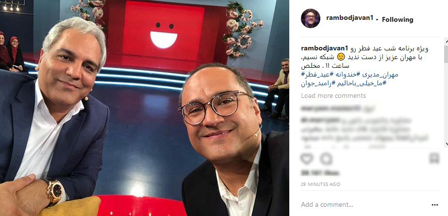 رامید جوان در اینستاگرامش از حضور مهران مدیری به عنوان مهمان در ويژه برنامه شب عيد فطر خندوانه خبر داد.