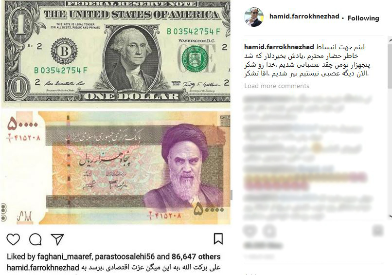 حمید فرخ نژاد بازیگر سینما و تلویزیون با انتشار تصویری از پست قبلی خود درباره دلار 5 هزار تومانی نوشت: اینم جهت انبساط خاطر حضار محترم ،يادش بخيردلار كه شد پنج هزار تومن چقد عصبانی شدیم ،خدا رو شکر الان دیگه عصبی نیستیم سِر شدیم ،اقا تشکر