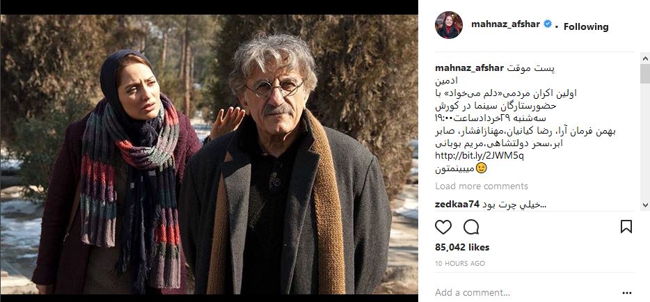مهناز افشار در صفحه اینستاگرامش از اولین اکران مردمی فیلم سینمایی دلم می خواد خبر داد.
