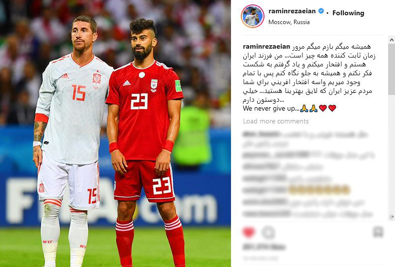 رامین رضاییان با انتشار این عکس در اینستاگرامش نوشت: هميشه ميگم بازم ميگم مرور زمان ثابت كننده همه چيز است... من فرزند ايران هستم و افتخار ميكنم و ياد گرفتم به شكست فكر نكنم و هميشه به جلو نگاه كنم پس با تمام وجود ميريم واسه افتخار افريني براي شما مردم عزيز ايران كه لايق بهترينا هستيد... خيلي دوستون دارم