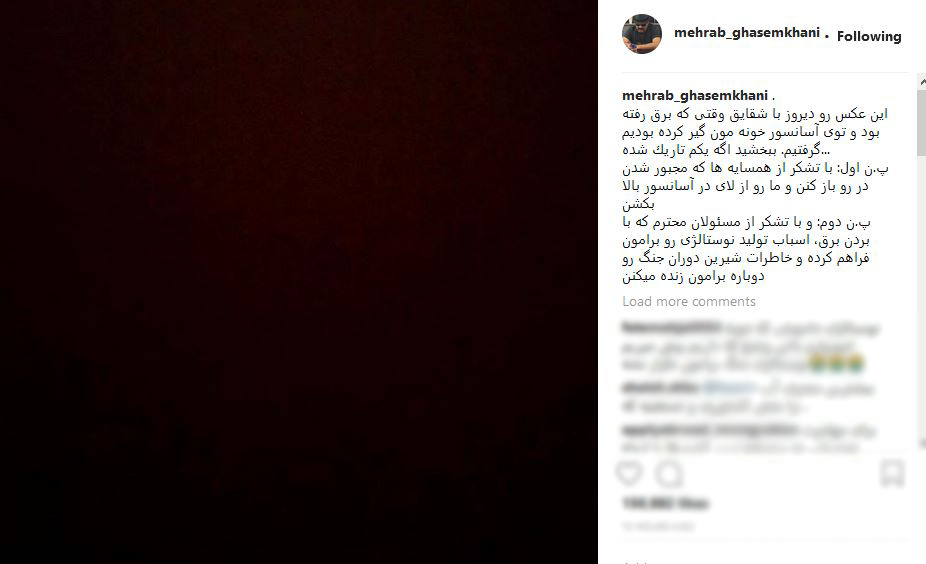 مهراب قاسم خانی با انتشار این عکس در اینستاگرامش نوشت: اين عكس رو ديروز با شقايق وقتى كه برق رفته بود و توى آسانسور خونه مون گير كرده بوديم گرفتيم. ببخشيد اگه يكم تاريك شده...