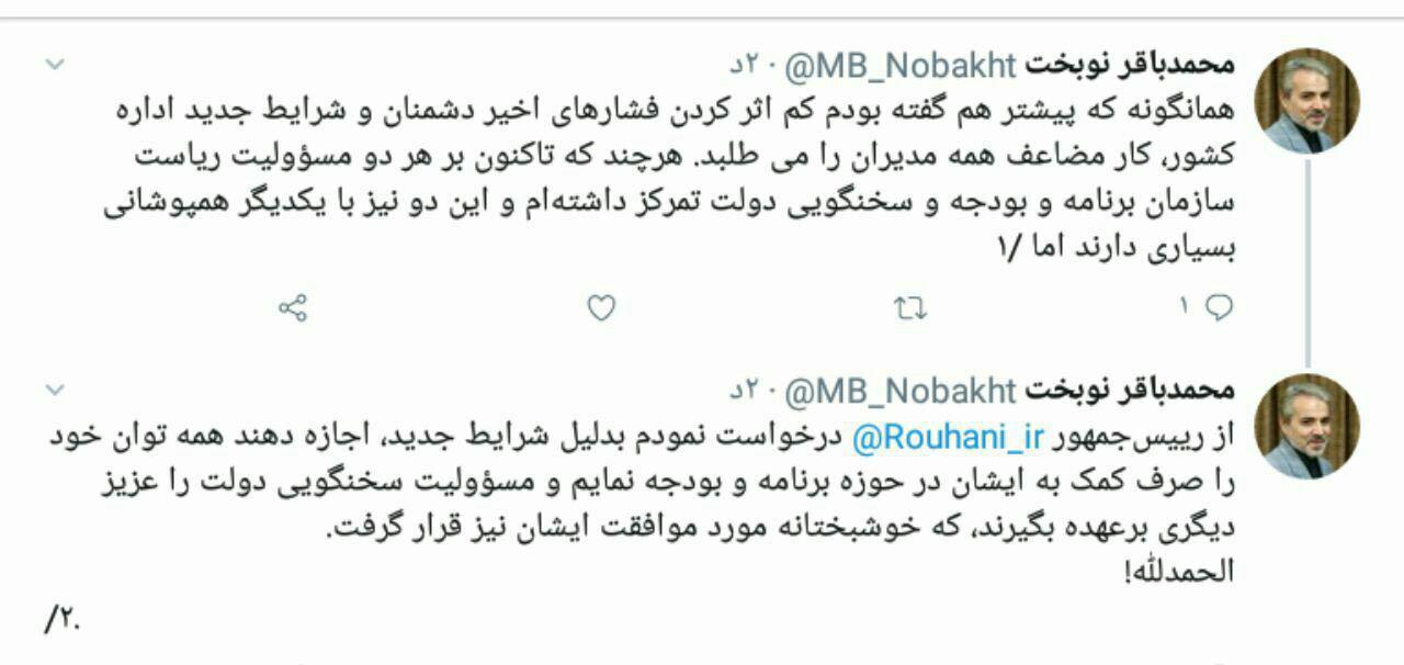 نوبخت در ریاست سازمان برنامه و بودجه ماند؛ سخنگویی دولت را فرد دیگری به عهده می‌گیرد
