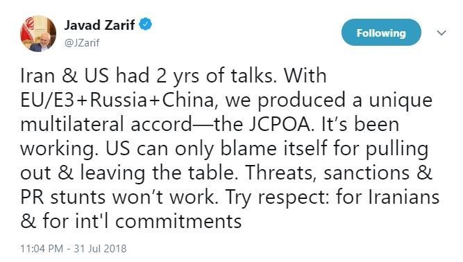 «ایران و ایالات متحده ۲ سال مذاکره داشتند. به همراه سه کشور اروپایی و اتحادیه اروپا به علاوه چین و روسیه یک توافق چندجانبه یکتا - برجام - را تدوین کردیم. این توافق کارایی داشت. ایالات متحده برای خروج از توافق و میز مذاکره باید خود را مقصر بداند. تهدید، تحریم و شیرین‌کاری‌های [تبلیغاتی]کارایی ندارند. تلاش کنید به ایرانی‌ها و تعهدات بین‌المللی احترام بگذارید.»